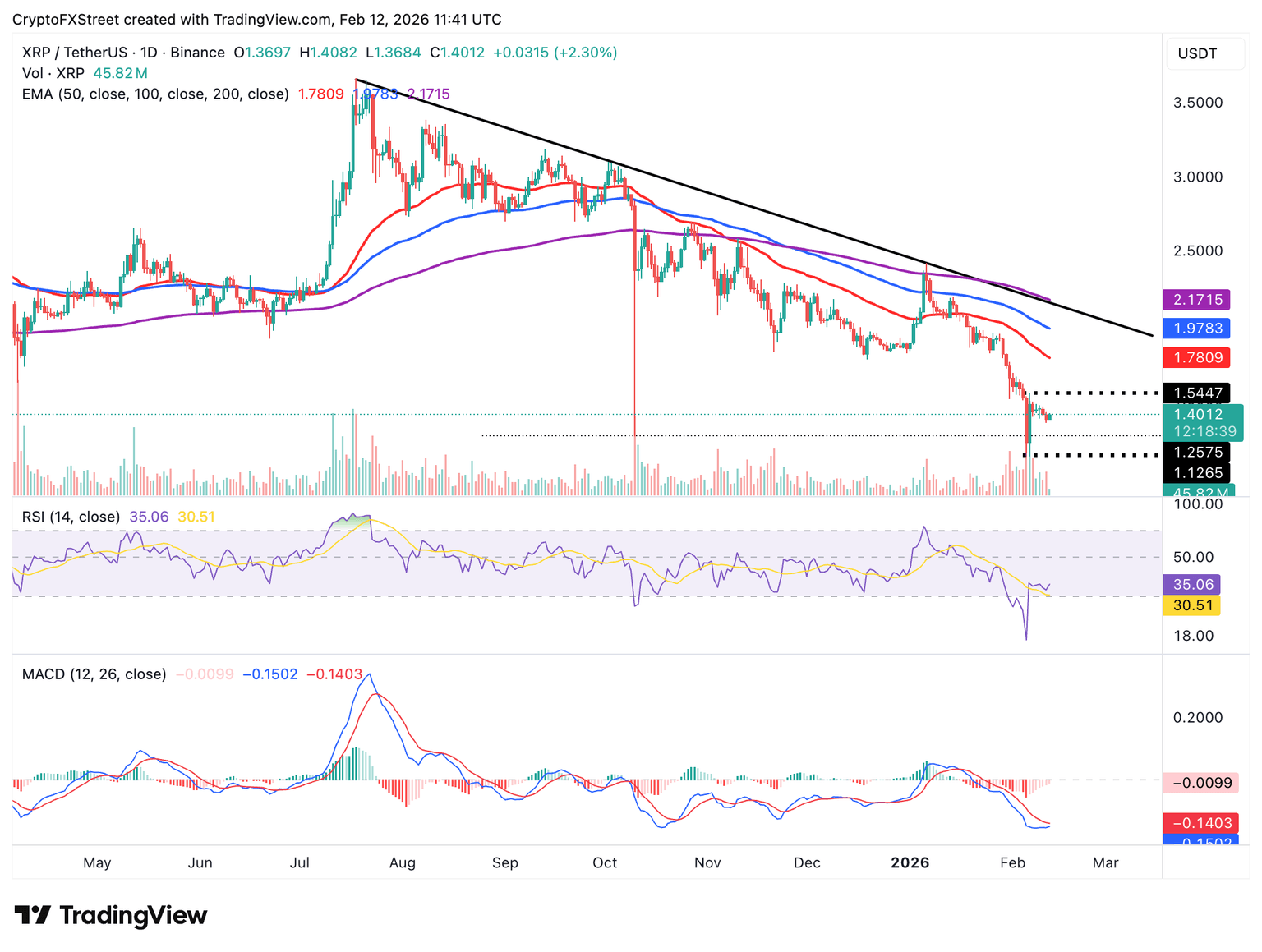 XRP se mantiene alrededor de 1.40$ después de un aumento del 2% intradía. El sutil rebote del token de remesas se basa en indicadores ligeramente positivos, comenzando con el Índice de Fuerza Relativa (RSI), que se ha recuperado de territorio de sobreventa a 35 en el gráfico diario. Una recuperación extendida en el RSI hacia la línea media podría confirmar una posible transición alcista.