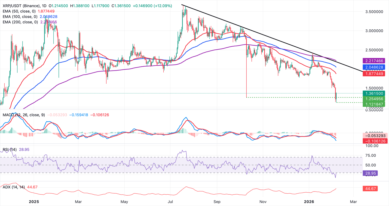 Ripple (XRP) está acelerando su recuperación, cotizando por encima de 1.36$ en el momento de escribir este artículo el viernes, mientras los inversores ajustan sus posiciones tras una semana turbulenta en el mercado de criptomonedas en general. El token de remesas ha subido más del 21% desde su mínimo intradía de 1.12$.