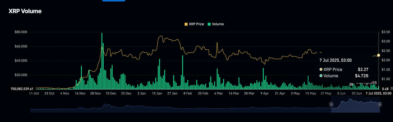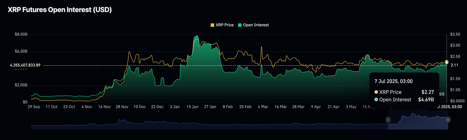 El interés en XRP abarca varios sectores del mercado, incluido el interés abierto de los contratos de futuros (OI), que ha aumentado aproximadamente un 25% a 4.69 mil millones de dólares desde que cayó a 3.54 mil millones de dólares el 23 de junio. Este es el nivel más alto desde el 30 de mayo.