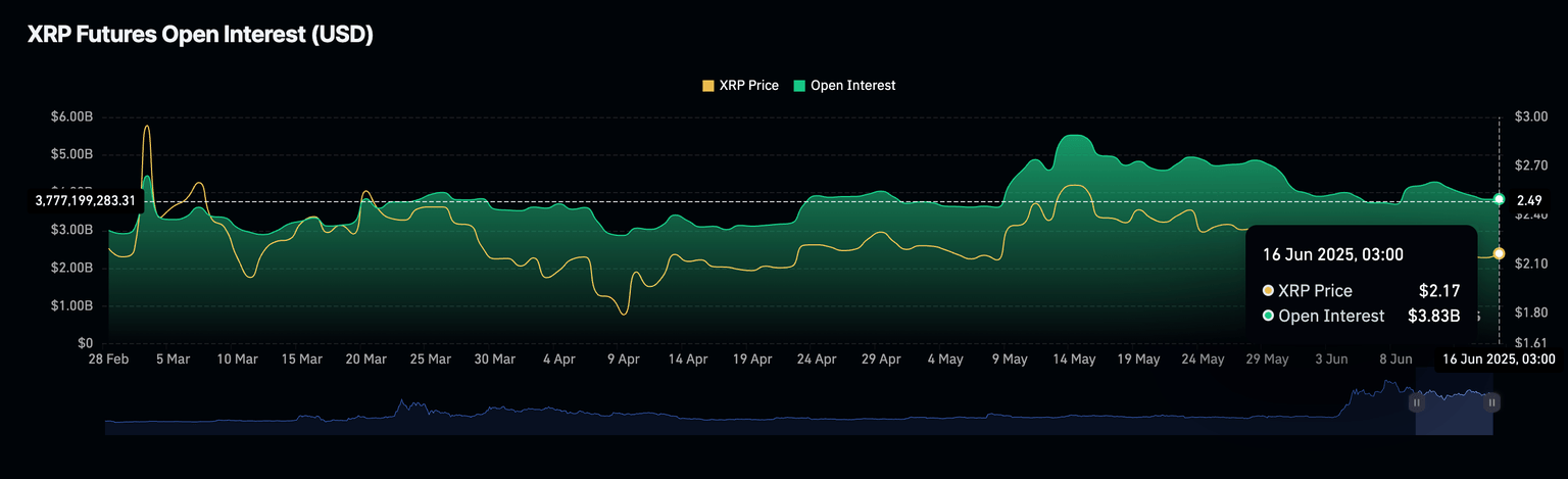 Mientras tanto, el interés dentro del microentorno está mostrando signos de consolidación, con el interés abierto de futuros de XRP (OI) estable en alrededor de 3.83 mil millones de dólares. En el gráfico a continuación, el OI se mantiene lateral pero sostiene una tendencia general a la baja desde el pico reciente de 5.52 mil millones de dólares, alcanzado a mediados de mayo.