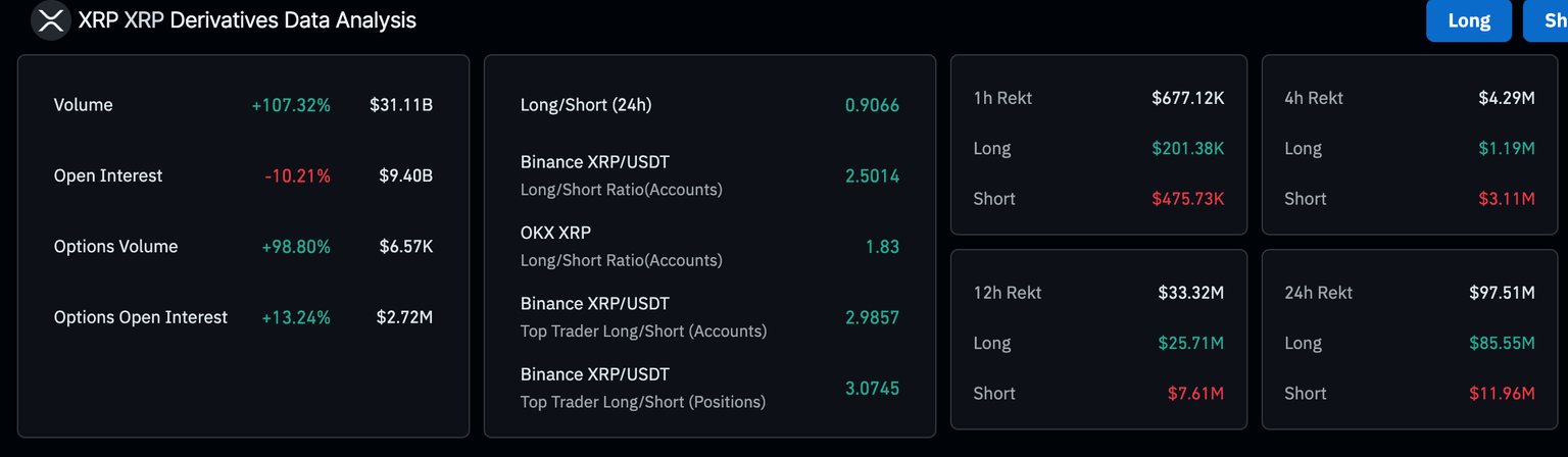 Si la reversión se desarrolla en una tendencia a la baja, indicaría una falta de convicción en la capacidad de XRP para mantener una tendencia alcista. Además, el aumento en las liquidaciones a 98 millones de dólares en las últimas 24 horas sugiere que XRP enfrenta una tendencia pesada al alza, lo que probablemente conducirá a un squeeze largo y a una venta masiva prolongada.