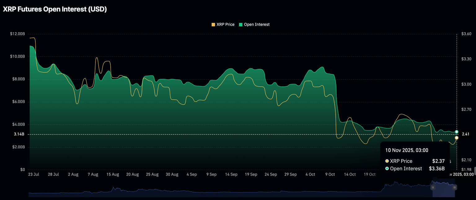 Mientras tanto, la demanda minorista de XRP sigue siendo relativamente baja, con el Interés Abierto (OI) promediando 3.36 mil millones de dólares el lunes en comparación con 4.17 mil millones de dólares el 7 de noviembre y 9 mil millones de dólares, el nivel máximo de octubre.