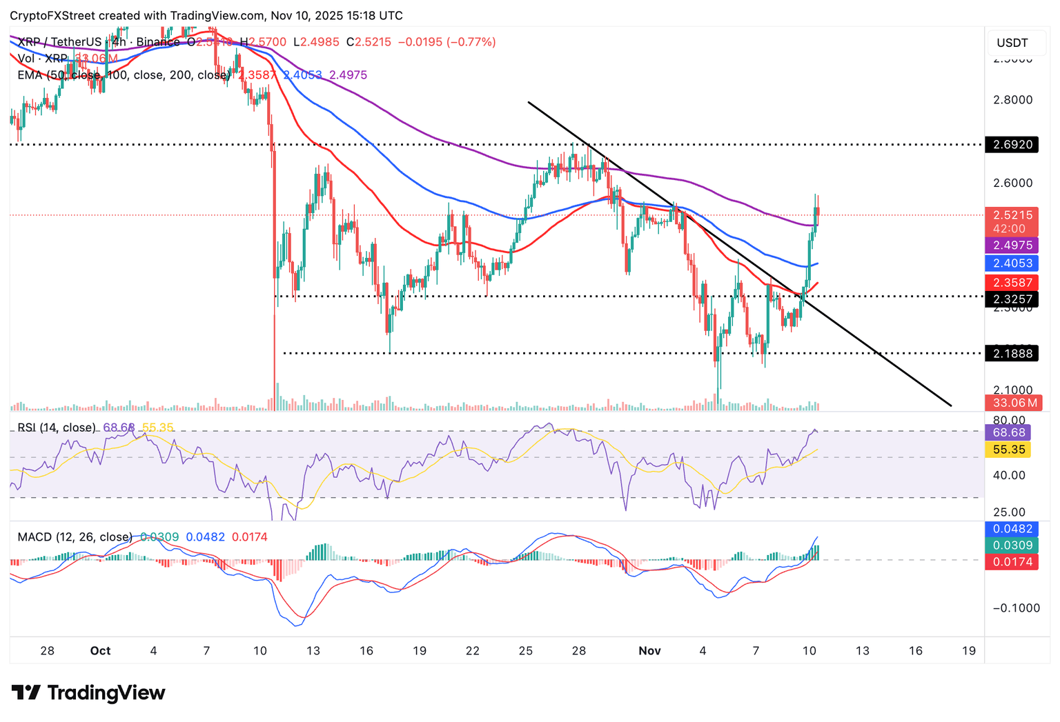 Ripple (XRP) sube junto a las principales criptomonedas, incluyendo Bitcoin (BTC) y Ethereum (ETH), para cotizar por encima de 2.50$ en el momento de escribir el lunes. El análisis técnico a corto plazo y el regreso del sentimiento de riesgo refuerzan la perspectiva alcista a corto plazo de XRP en el mercado de criptomonedas más amplio.