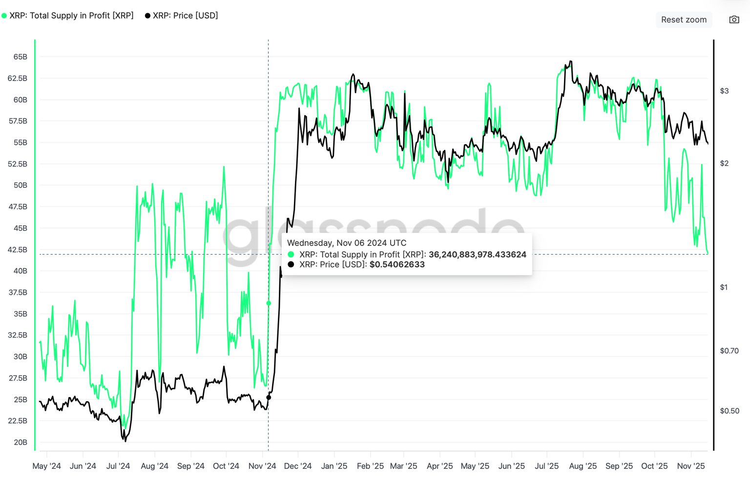 La oferta en ganancias en el libro mayor de XRP (XRPL) ha disminuido significativamente a 42 mil millones de XRP, desde un récord de 68 mil millones en julio. La disminución de aproximadamente el 38% se mantiene cerca de los niveles vistos por última vez en noviembre de 2024, lo que sugiere que los inversores han estado tomando beneficios.