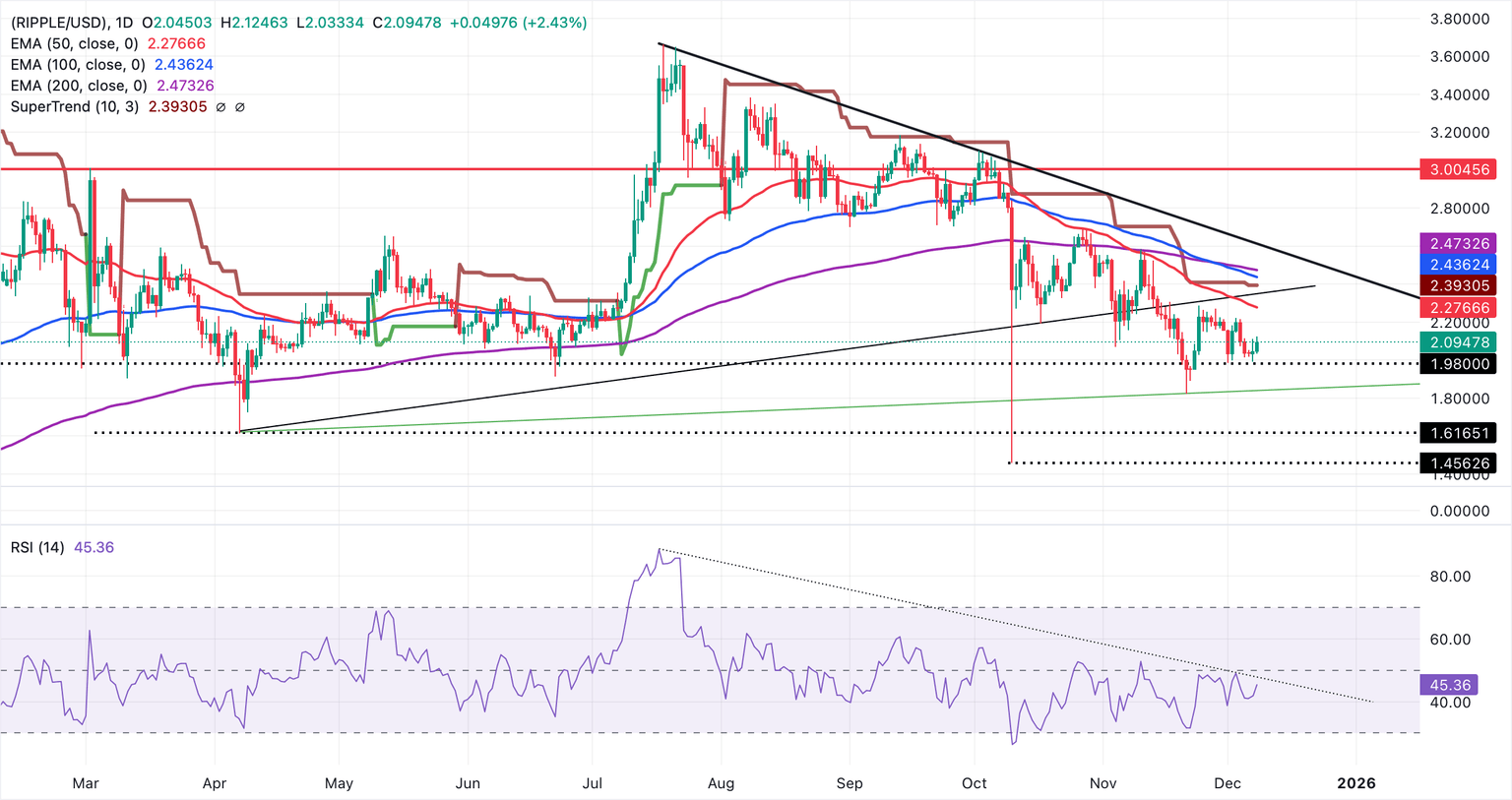 XRP se está negociando por encima de su soporte a corto plazo de 2.00$, mientras que la media móvil exponencial (EMA) de 50 días en 2.27$, la EMA de 100 días en 2.43$ y la EMA de 200 días en 2.47$ descienden, afirmando una perspectiva general bajista. El indicador SuperTrend en el gráfico diario se sitúa en 2.39$, reforzando la resistencia superior y manteniendo los rebotes limitados.