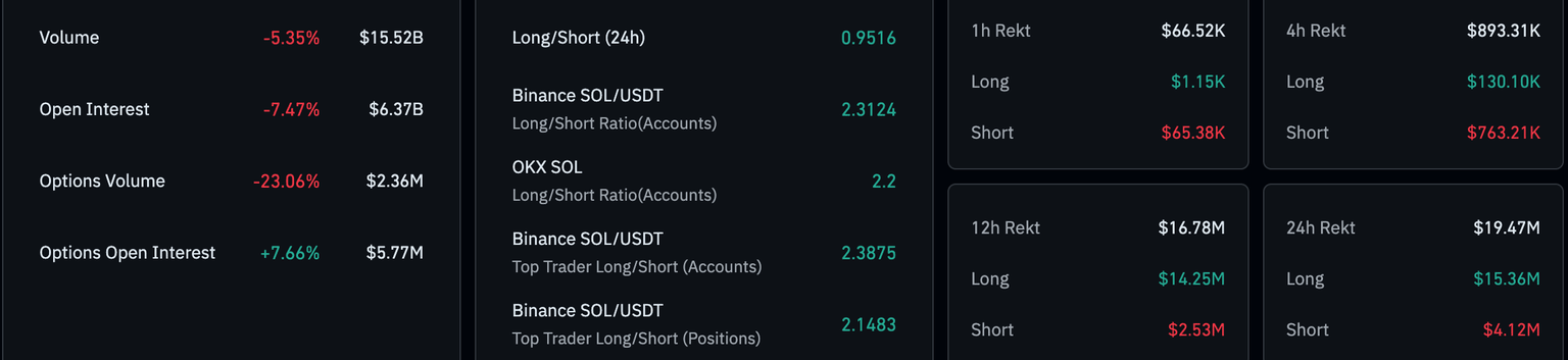 - Un aumento en las liquidaciones largas desencadena una caída en el Interés Abierto de SOL, indicando bajo optimismo.