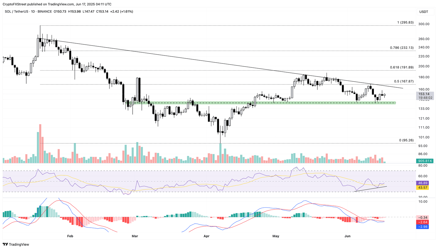 Solana está manteniendo el rally de reversión desde la zona de soporte de 140$, cotizando por encima de 150$ en el momento de la redacción. Con el aumento intradía, el camino de menor resistencia en SOL apunta a la línea de tendencia superior formada por picos el 18 de enero, 13 de mayo, 22 de mayo y 11 de junio.