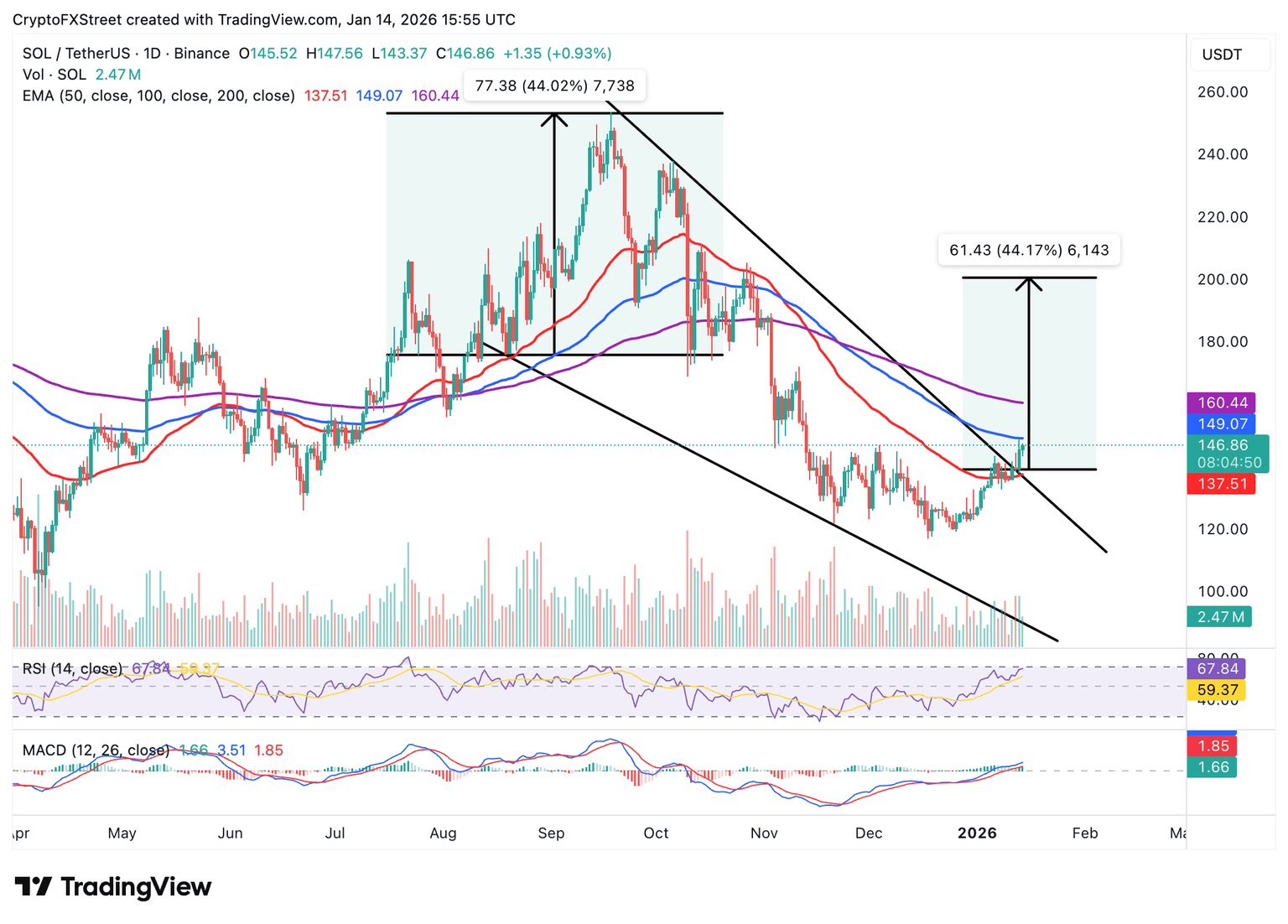 La ruptura proyecta un aumento potencial del 44% en valor hasta 200$, pero primero, Solana debería cerrar por encima de la media móvil exponencial (EMA) de 100 días en 149$ para confirmar su tesis alcista.