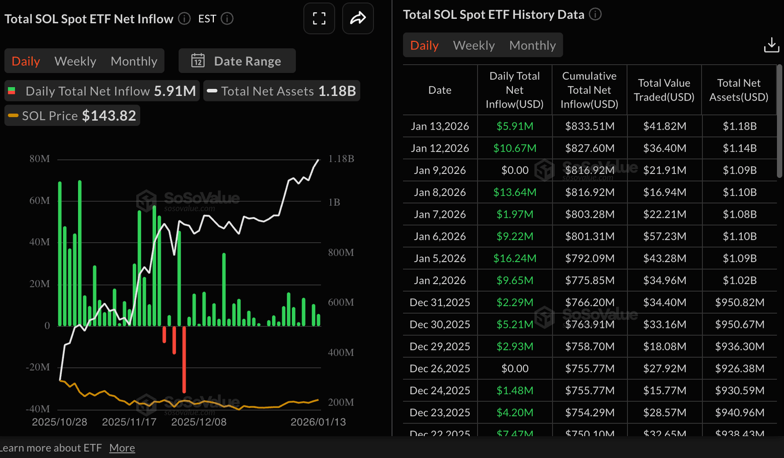 Los datos de SoSoValue muestran un volumen de entrada acumulado de aproximadamente 834 millones de dólares y activos netos de 1.180 millones de dólares. Las entradas institucionales incipientes sugieren que Solana podría estar lista para la adopción y una tendencia alcista prolongada a corto y medio plazo.