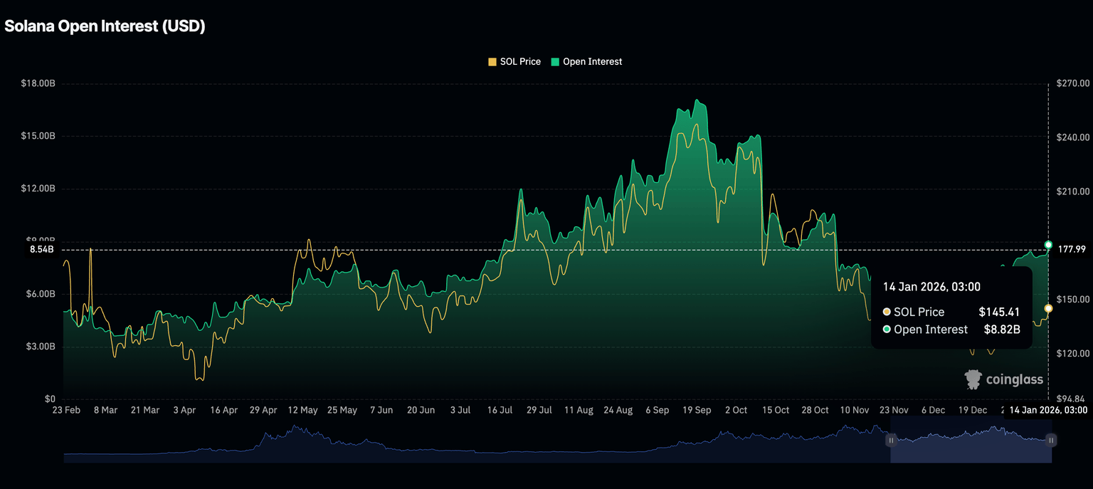Mientras tanto, el mercado de derivados de Solana refleja el optimismo de los inversores por una recuperación de precios, con el interés abierto de futuros (OI) aumentando a 8.800 millones de dólares el miércoles, su nivel más alto desde principios de noviembre.