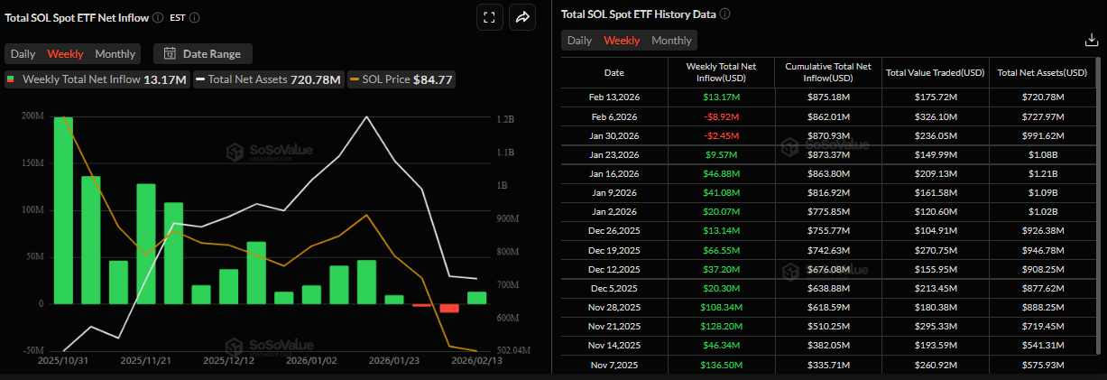 La demanda institucional por Solana muestra signos tempranos de recuperación. Según datos de SoSoValue, los ETFs al contado registraron entradas de 13.17 millones de dólares la semana pasada, rompiendo una racha de dos semanas de salidas desde finales de enero. Si esta tendencia de entrada continúa e intensifica, el precio de Solana podría recuperarse.