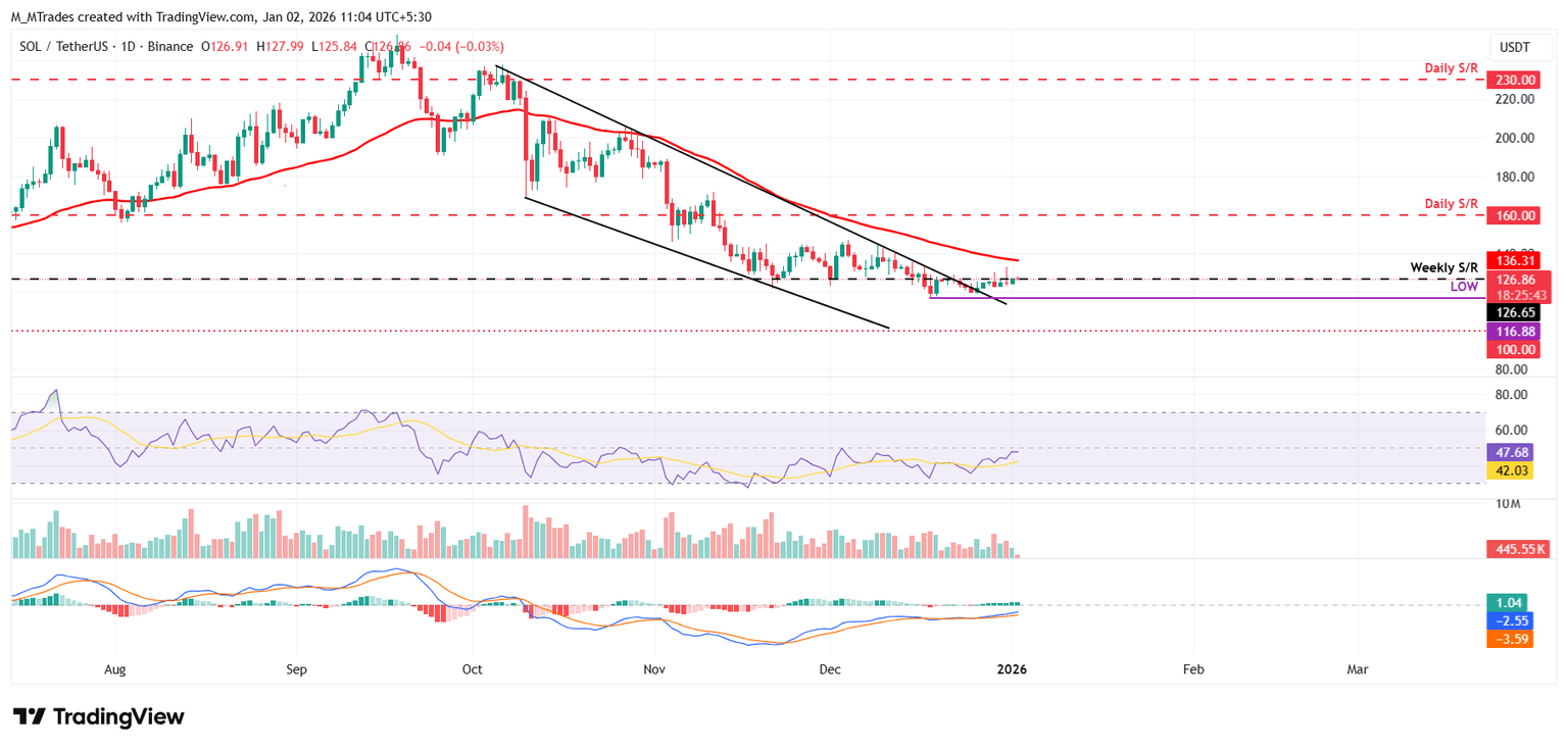 El precio de Solana rompió por encima de la línea de tendencia superior de un patrón de cuña descendente (dibujado al unir múltiples máximos y mínimos desde principios de octubre) el 26 de diciembre, subió ligeramente, pero no logró cerrar por encima de la resistencia semanal en 126.65$ hacia finales de diciembre. El jueves, SOL subió un 2% y cerró por encima de este nivel de resistencia; hasta el viernes, se mantiene por encima de 126.86$.