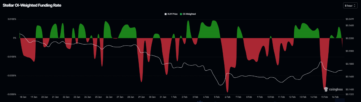 Los datos de la tasa de financiación ponderada por OI de CoinGlass muestran que el número de operadores que apuestan a que el precio de XLM caerá más es mayor que aquellos que anticipan un aumento del precio.