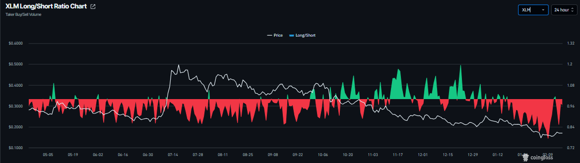 La métrica se volvió negativa el martes y se sitúa en -0.0050%. La relación negativa sugiere que los cortos están pagando a los largos, lo que indica un sentimiento bajista hacia XLM.