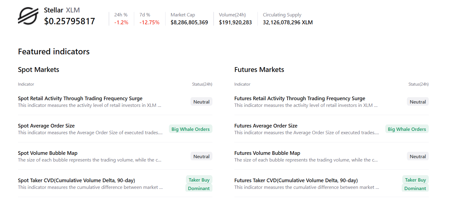 Los datos resumidos de CryptoQuant apoyan una perspectiva positiva para XLM, ya que tanto los mercados al contado como los de futuros muestran grandes órdenes de ballenas y dominio de compra, señalando un posible rally por delante.