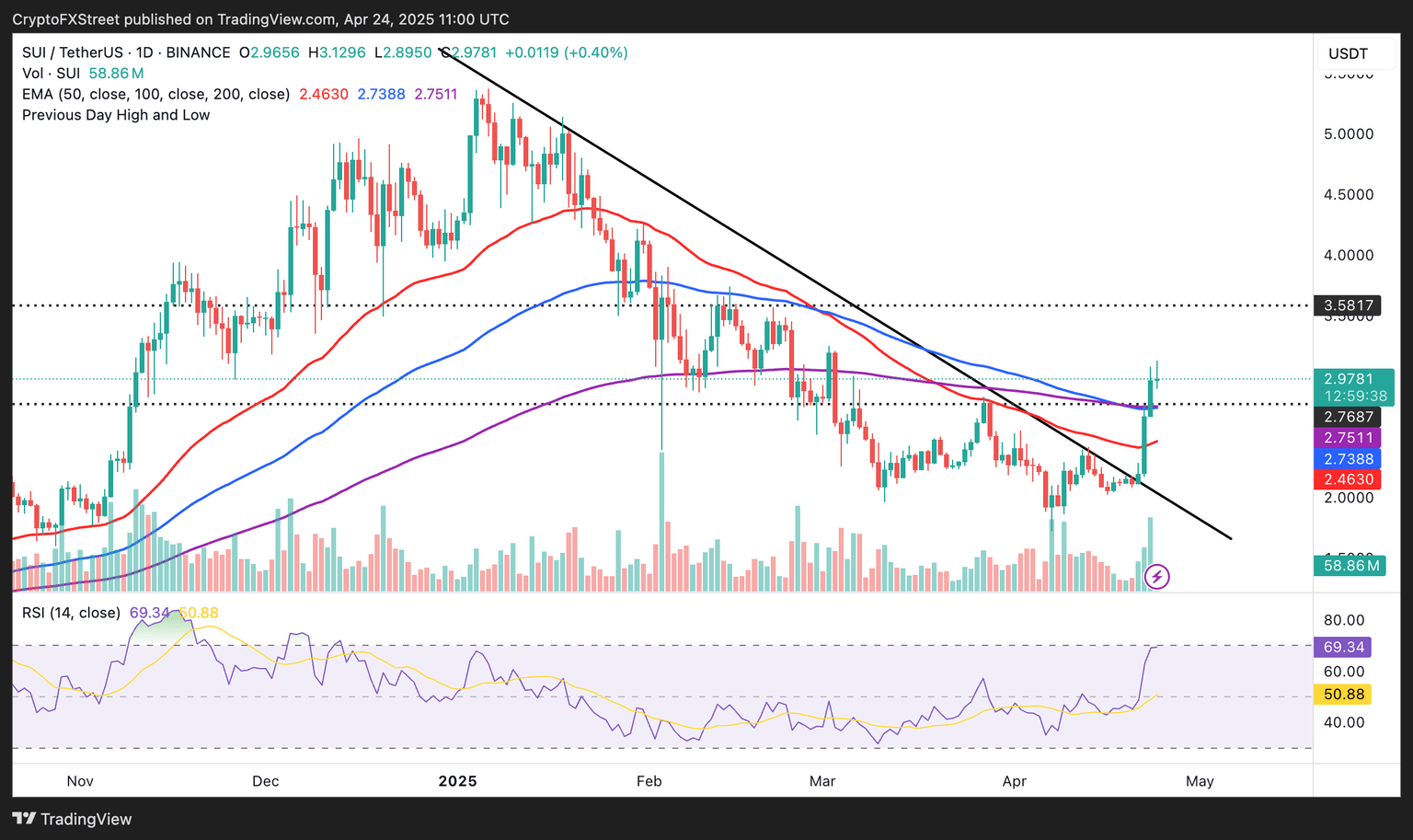 El precio de Sui se sitúa en 2.98$, tras un reciente breakout por encima de la línea de tendencia descendente. El Índice de Fuerza Relativa (RSI) cerca del territorio de sobrecompra en 69.26 refuerza un creciente impulso alcista.