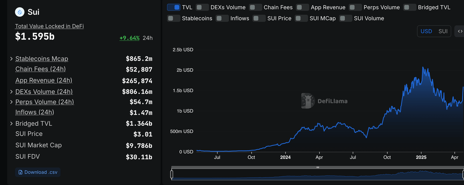 Sui está emergiendo como un fuerte contendiente entre las blockchains de capa 1 en la industria de criptomonedas. Según DefiLlama, el Valor Total Bloqueado (TVL), que representa la suma total de todas las monedas mantenidas en contratos inteligentes a través de todos los protocolos en la cadena, aumentó un 9.64% hasta 1.595 millones de dólares.