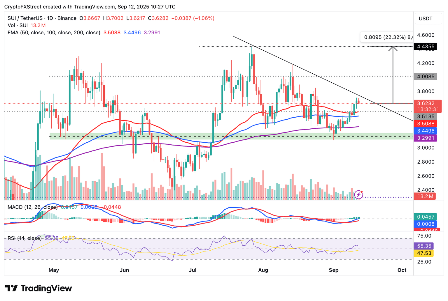 Sui se mantiene significativamente por encima de las medias móviles clave, incluyendo la media móvil exponencial (EMA) de 50 días en 3.50 $, la EMA de 100 días en 3.44 $ y la EMA de 200 días en 3.29 $, todas las cuales tienen una ligera pendiente ascendente, reforzando el sentimiento alcista.