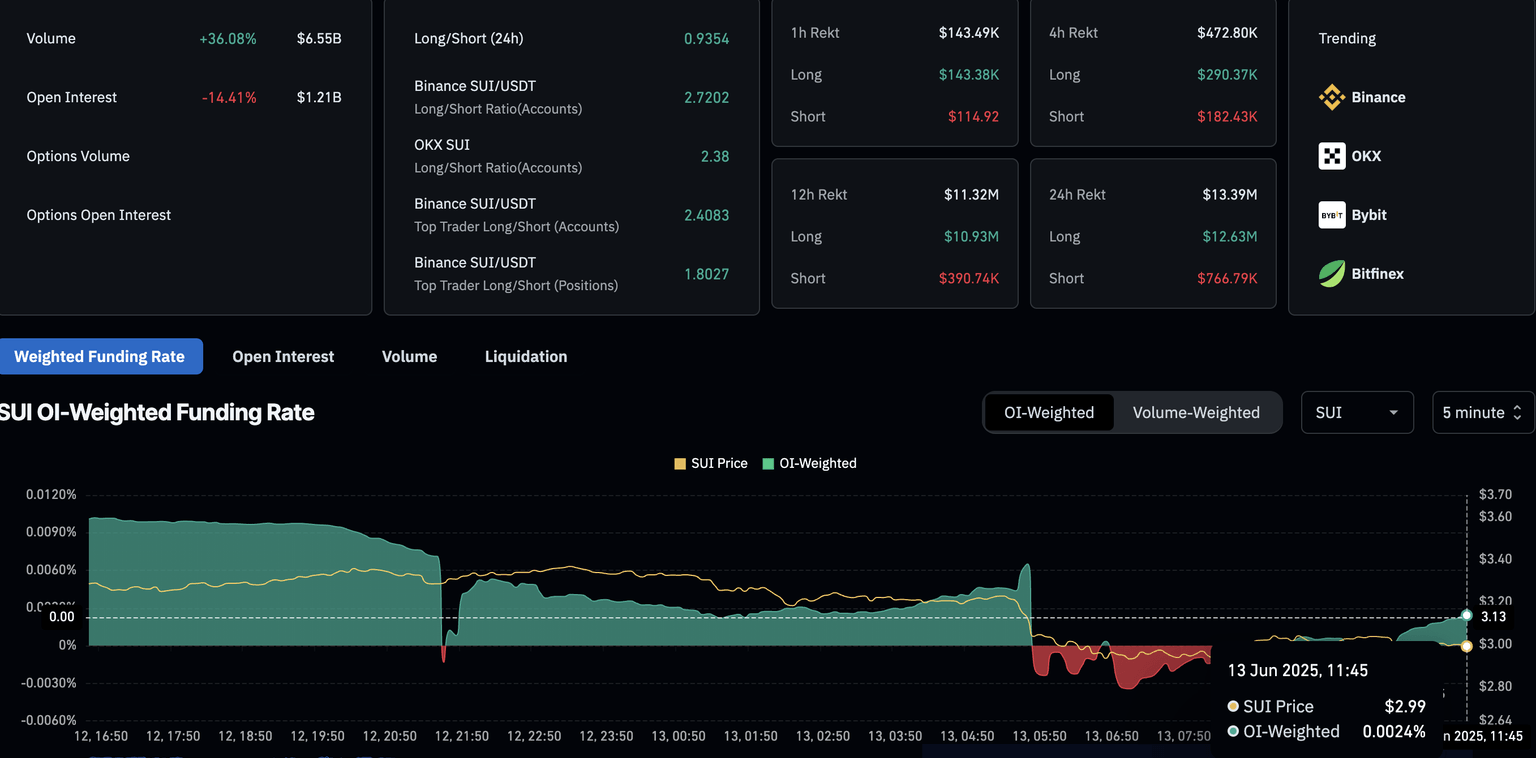 Los datos de CoinGlass muestran que el interés abierto (OI) de SUI ha disminuido un 14% a 1.200 millones de dólares en las últimas 24 horas. Un repentino colapso en el OI se alinea con la venta masiva del mercado más amplio y la eliminación de los operadores alineados con la tendencia alcista.