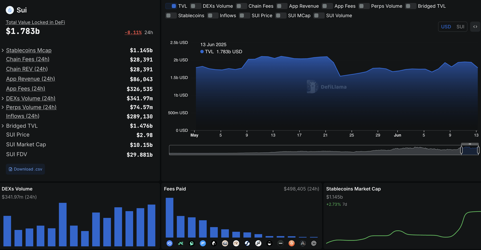 El Valor Total Bloqueado (TVL) de Sui, que representa el capital bloqueado en la red para apoyar los servicios de Finanzas Descentralizadas (DeFi), ha caído a 1.783 millones de dólares, una disminución del 8.11% en 24 horas. Esto sugiere una disminución de la actividad.