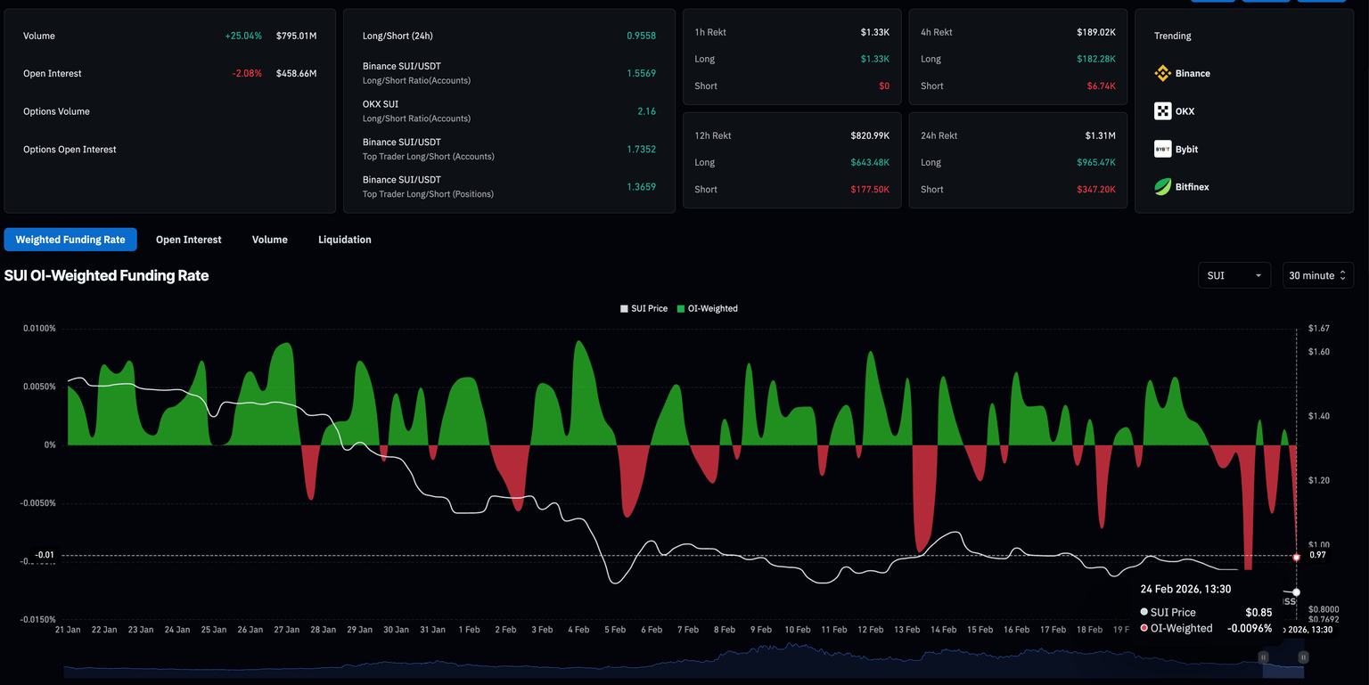 Los datos de CoinGlass muestran que el Interés Abierto (OI) de SUI está en 458,66 millones $, con una caída del 2,08% en las últimas 24 horas, lo que indica una salida de capital del mercado de derivados. Esto se alinea con una liquidación larga de 965.470 $ en el mismo período de tiempo, superando las liquidaciones cortas de 347.200$.