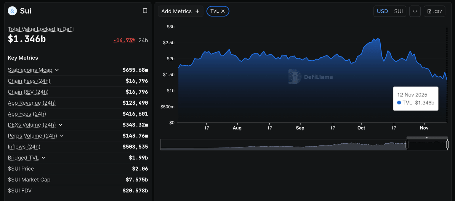 El TVL de Sui, que alcanzó un máximo histórico de 2.63 mil millones de dólares el 9 de octubre, ha mantenido una tendencia a la baja, reflejando el sentimiento de aversión al riesgo en el mercado de criptomonedas más amplio.