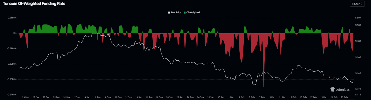 En el lado de los derivados, las tasas de financiación negativas de TON proyectan aún más el sentimiento bajista. La métrica se vuelve negativa el martes y se sitúa en -0.011% el miércoles, acercándose a los niveles vistos el 19 de febrero, cuando los precios de TON cayeron drásticamente. La relación negativa sugiere que los cortos están pagando a los largos, lo que indica un sentimiento bajista hacia Toncoin.