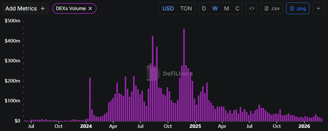 Los datos de DefliLlama indican que el volumen de operaciones semanal de los intercambios descentralizados (DEXs) de Toncoin ha disminuido a 12.6 millones de dólares hasta ahora esta semana, los niveles más bajos desde principios de enero de 2024. Esta caída en el volumen indica una disminución en el interés y la liquidez de los traders en Toncoin, aumentando su perspectiva bajista.