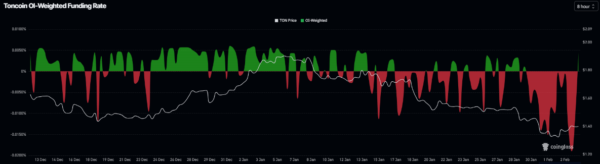 Los datos de la tasa de financiación ponderada por OI de CoinGlass muestran que el número de operadores que apuestan a que el precio de TON caerá más es menor que el de aquellos que anticipan un aumento del precio.