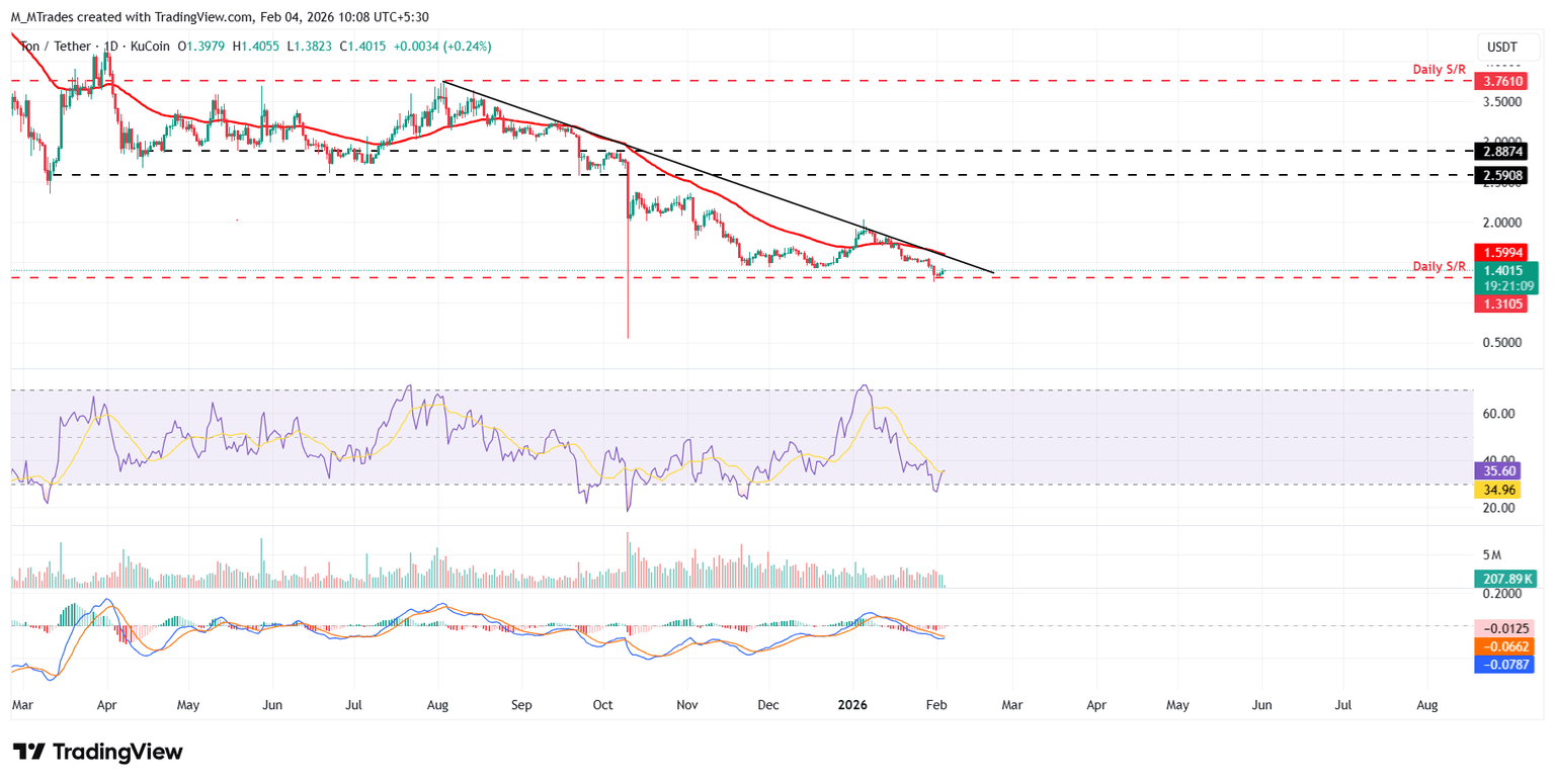 Por otro lado, si TON enfrenta una corrección, podría extender el declive hacia el soporte diario en 1.31$.