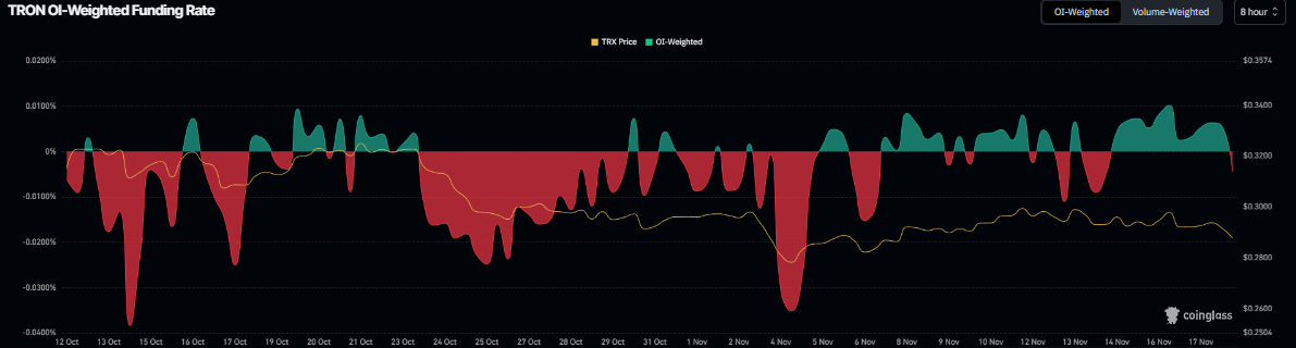 Los datos de derivados para Tron respaldan una perspectiva bajista. Los datos de la tasa de financiamiento ponderada por OI de Coinglass muestran que el número de traders que apuestan a que el precio de TRX caerá más es mayor que aquellos que anticipan un aumento en el precio.