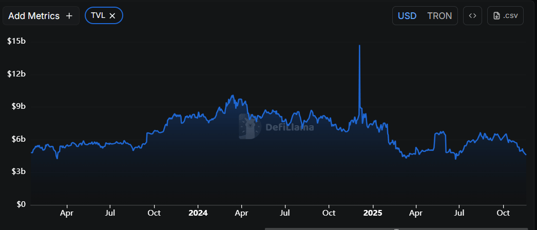 Los datos de DefiLlama muestran que el TVL de Tron cayó a 4.58 mil millones de dólares el martes y ha estado disminuyendo constantemente desde principios de octubre. La caída del TVL señala una actividad debilitada y un compromiso de usuario menguante en el ecosistema de Tron, lo que implica que menos participantes están depositando o interactuando con los protocolos basados en TRX, lo que no augura nada bueno para su precio.