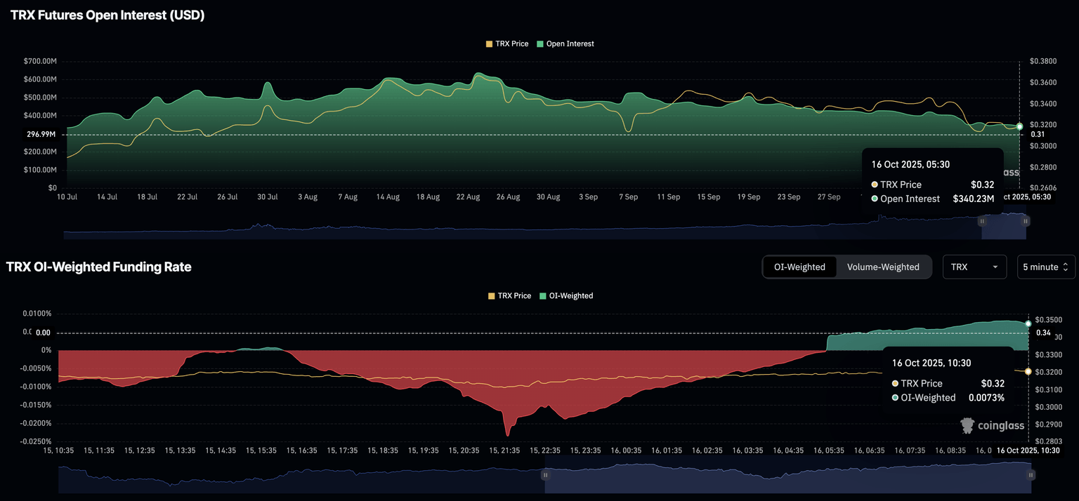 La demanda de Tron continúa fluctuando, un efecto secundario de la volatilidad del mercado en general. Los datos de CoinGlass muestran una disminución constante en el interés abierto de futuros de TRX (OI), que se sitúa en 340.32 millones de dólares el jueves. Una tendencia a la baja en el OI indica que los participantes del mercado están asustados, lo que resulta en una desapalancamiento o retiro de capital.