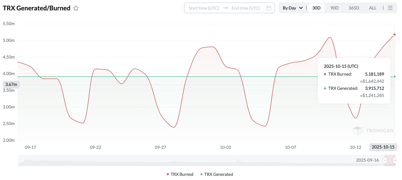 Mientras tanto, la disponibilidad del token nativo de Tron está disminuyendo a medida que el proceso de quema supera la generación de TRX. La presión deflacionaria está aumentando gradualmente tras la reciente volatilidad del mercado, como lo evidencia la quema de 5.18 millones de tokens TRX en comparación con la generación constante de 3.91 millones de tokens TRX el martes. Un aumento constante en la deflación podría llevar a un aumento en el precio de TRX basado en la lógica general de oferta y demanda.