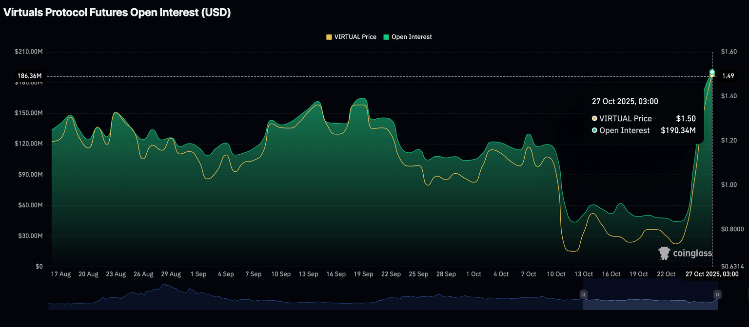 Virtuals Protocol se cotiza en el nivel más alto desde mediados de agosto, respaldado por un aumento significativo en la demanda minorista. Según datos de CoinGlass, el Open Interest (OI) de futuros de VIRTUAL ha explotado a aproximadamente 190 millones de dólares, el nivel más alto desde principios de agosto.