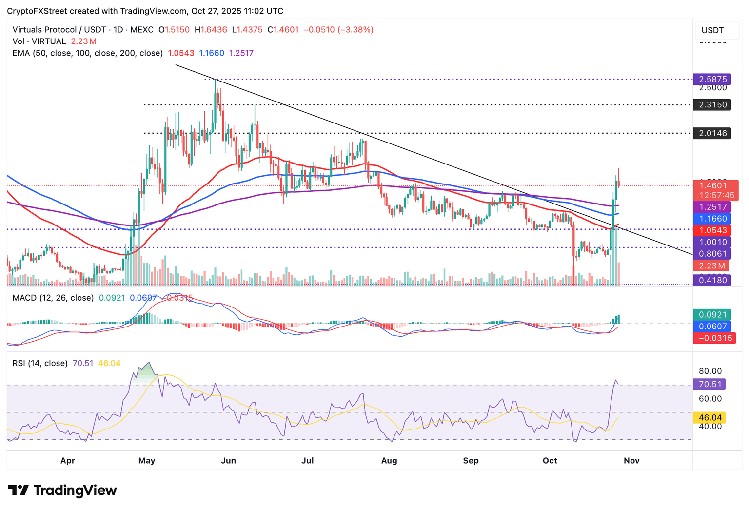 Virtuals Protocol (VIRTUAL) se desliza por debajo de 1.50$ en el momento de escribir el artículo el lunes, ya que los toros luchan por mantener un aumento de precio masivo del 20% en las últimas 24 horas, según CoinGecko.