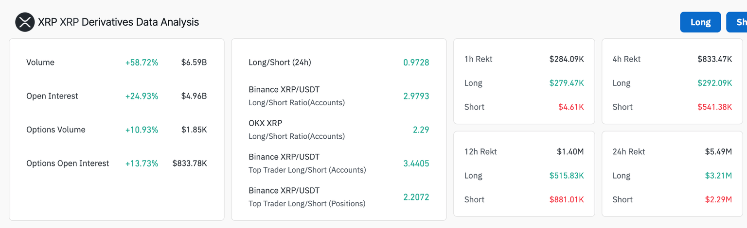 La tendencia alcista de XRP está ganando tracción con el interés abierto (OI) disparándose casi un 25% a 4.960 millones de dólares. Este aumento señala un sólido regreso en la participación del mercado combinado con un volumen de negociación que ha aumentado aproximadamente un 59% a 6.590 millones de dólares en las últimas 24 horas.