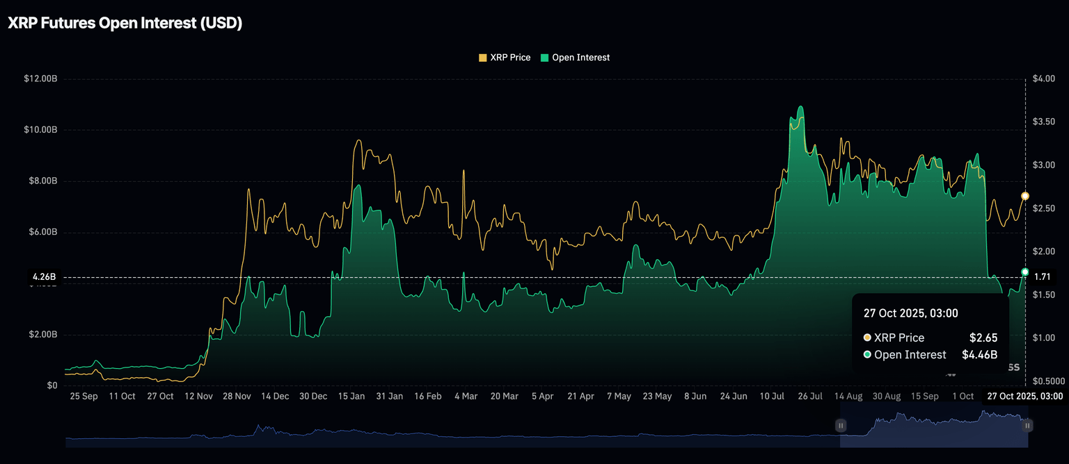 - XRP enfrenta un mercado de derivados débil tras una caída del 40% en el interés abierto de futuros en octubre.