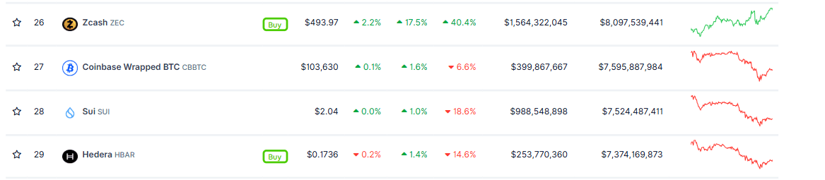 Zcash se disparó más del 17% hasta ahora esta semana y se acerca a la marca de 500$ en el momento de escribir el jueves. Los datos de CoinGecko muestran que la capitalización de mercado de ZEC ha aumentado por encima de los 8 mil millones de dólares, colocándolo en el puesto 26 en el mercado de criptomonedas en general y superando a altcoins populares como SUI y HBAR.