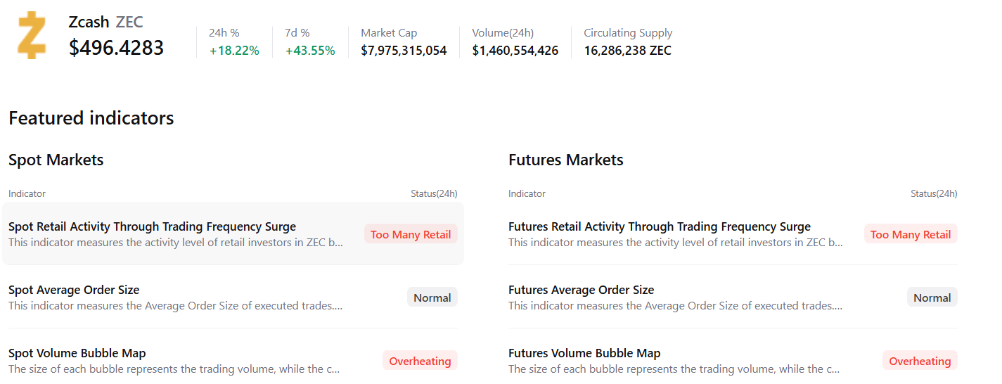 A pesar del panorama alcista para ZEC, los datos resumidos de CryptoQuant muestran algunas señales de preocupación a tener en cuenta. Tanto los mercados al contado como los de futuros están mostrando signos de que la actividad minorista podría estar sobrecalentándose.