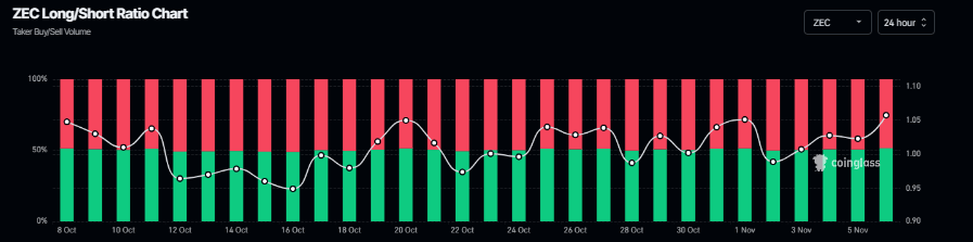 Además, la relación largo-corto para la criptomoneda centrada en la privacidad se situó en 1.05 el jueves, acercándose a su máximo mensual. Esta relación, por encima de uno, refleja un sentimiento alcista en los mercados, ya que más operadores están apostando a que ZEC se recupere.