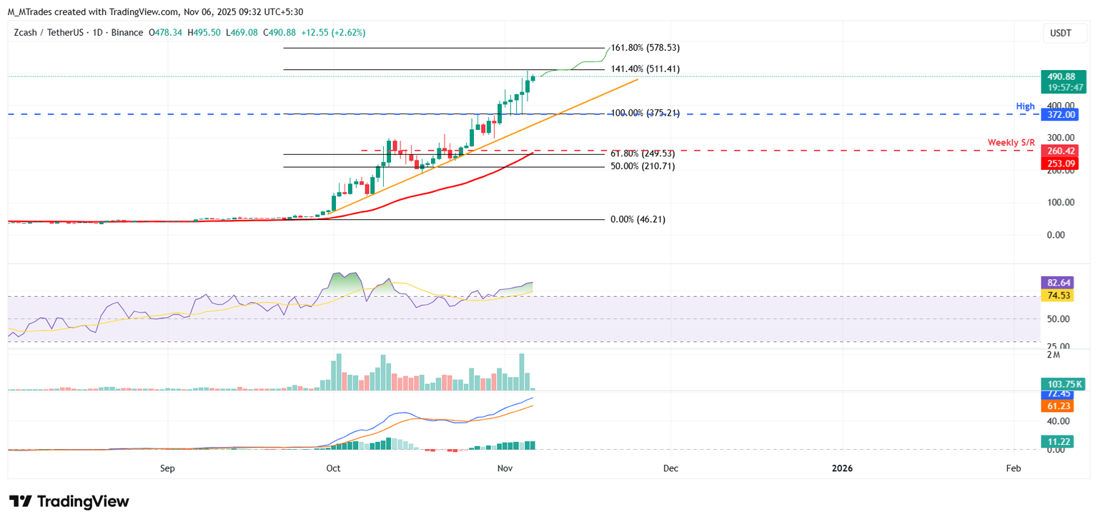Pronóstico de Zcash: Los compradores de ZEC apuntan a 580$ tras la ruptura mientras la capitalización de mercado supera los 8.000 millones de dólares