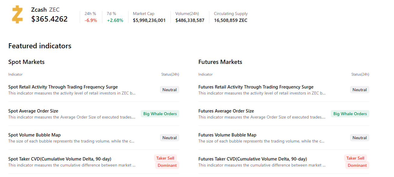 Los datos resumidos de CryptoQuant sugieren que el sentimiento de ZCash entre los operadores es mixto. Si bien hay grandes órdenes de ballenas tanto en los mercados al contado como de futuros, lo que sugiere un interés alcista, el creciente dominio del lado vendedor indica que la presión de venta sigue siendo elevada. Esta combinación sugiere indecisión entre los inversores y limita las posibilidades de una recuperación sostenida.