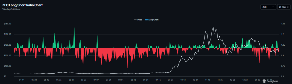 De manera similar, el mercado de derivados es cauteloso. Los datos de CoinGlass muestran que la tasa de financiación de ZEC se volvió positiva el miércoles y está en 0.0091% el jueves, lo que indica que las posiciones largas están pagando a las cortas y sugiere un sentimiento alcista. Sin embargo, la relación larga-corta ha caído a 0.94, señalando un aumento en las apuestas cortas. Esta divergencia resalta la creciente incertidumbre en el mercado de derivados y debilita la convicción alcista.