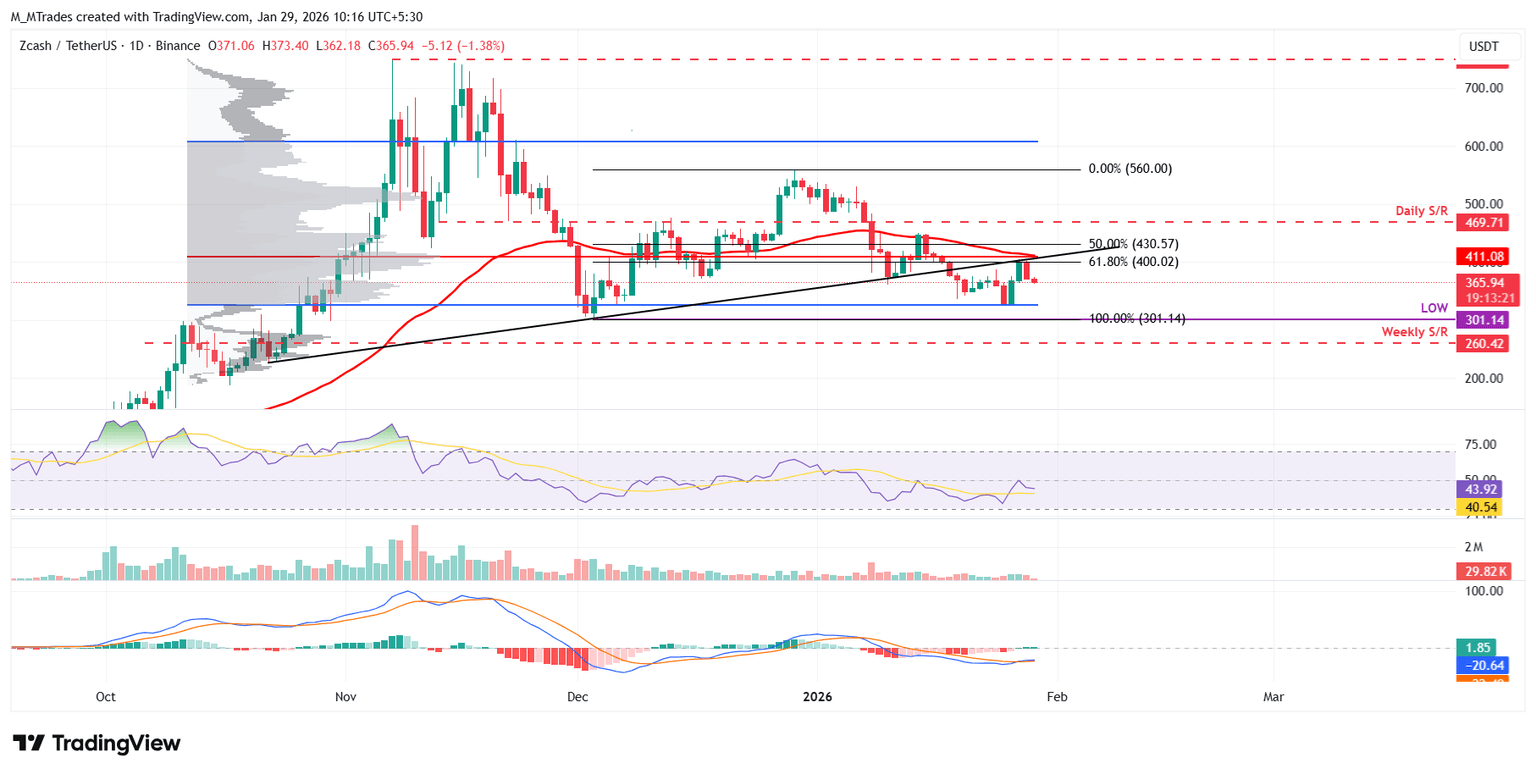 El precio de Zcash (ZEC) sigue cotizando en rojo, por debajo de 366$ el jueves, tras no lograr romper la línea de tendencia previamente rota en los últimos días. Los datos en cadena y de derivados indican un sentimiento mixto entre los operadores, limitando aún más las posibilidades de una recuperación del precio.