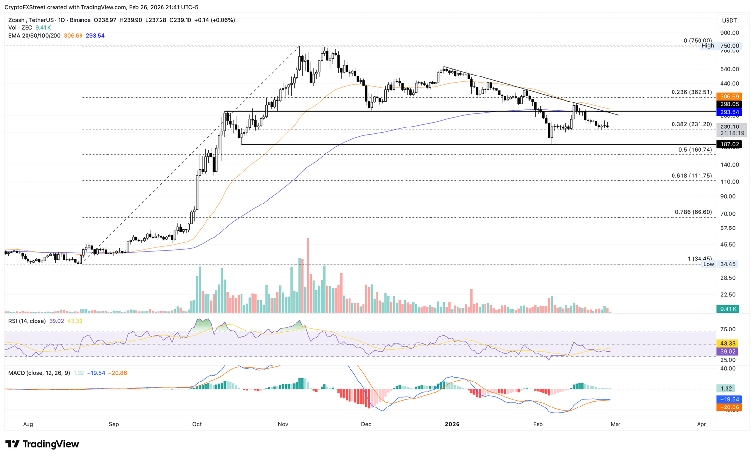 Zcash prueba el nivel de retroceso de Fibonacci del 38.2% en 231$, medido desde el mínimo del 20 de agosto de 34.45$ hasta el máximo del 7 de noviembre de 750$. La moneda de privacidad se mueve por debajo de las medias móviles exponenciales (EMA) de 50 días y 200 días en declive, manteniendo una fase de corrección más amplia desde el pico del año pasado.