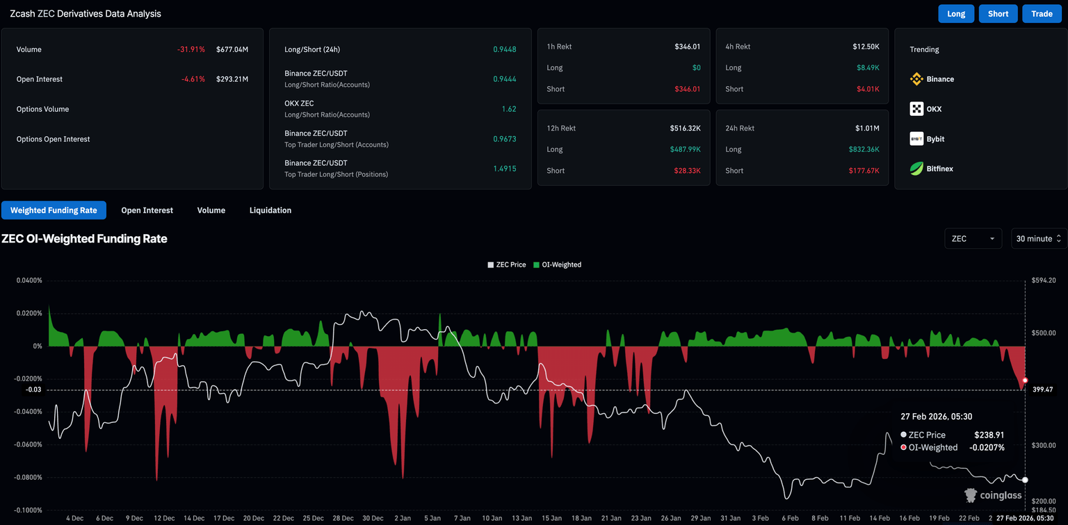 En el lado de los derivados, la presión del mercado añade al sesgo bajista en Zcash, ya que los datos de CoinGlass muestran que el Interés Abierto (OI) de ZEC ha caído un 4.61% en las últimas 24 horas, a 293.21 millones de dólares. Una caída en el OI sugiere un valor nocional reducido de los contratos pendientes debido a liquidaciones forzadas, un apetito por el riesgo de los inversores reducido, o ambos. Las liquidaciones largas de 832.360$ durante el mismo período superan las liquidaciones cortas de 177.670$, reduciendo significativamente la acumulación de posiciones en el lado alcista evidenciada por una relación larga-corta de 0.9448.