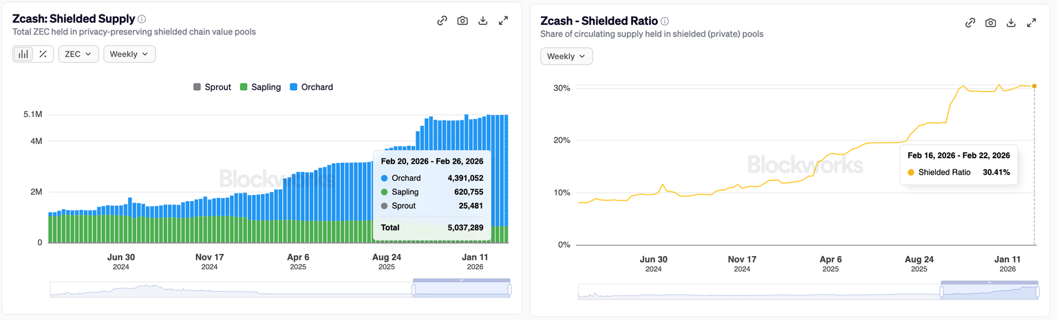 Además, los datos de Blockworks muestran que la oferta protegida en las piscinas de privacidad de Zcash, incluyendo Sprout, Sapling y Orchard, está saturándose por encima del 30%, manteniendo 5.03 millones de tokens ZEC hasta el viernes. Además, los datos de Blockworks muestran que la oferta protegida en las piscinas de privacidad de Zcash, incluyendo Sprout, Sapling y Orchard, está saturándose por encima del 30%, manteniendo 5.03 millones de tokens ZEC hasta el jueves. Una estancación en los nuevos flujos hacia la moneda de privacidad reafirma la disminución de la necesidad de los inversores de proteger sus tokens ZEC por privacidad financiera.