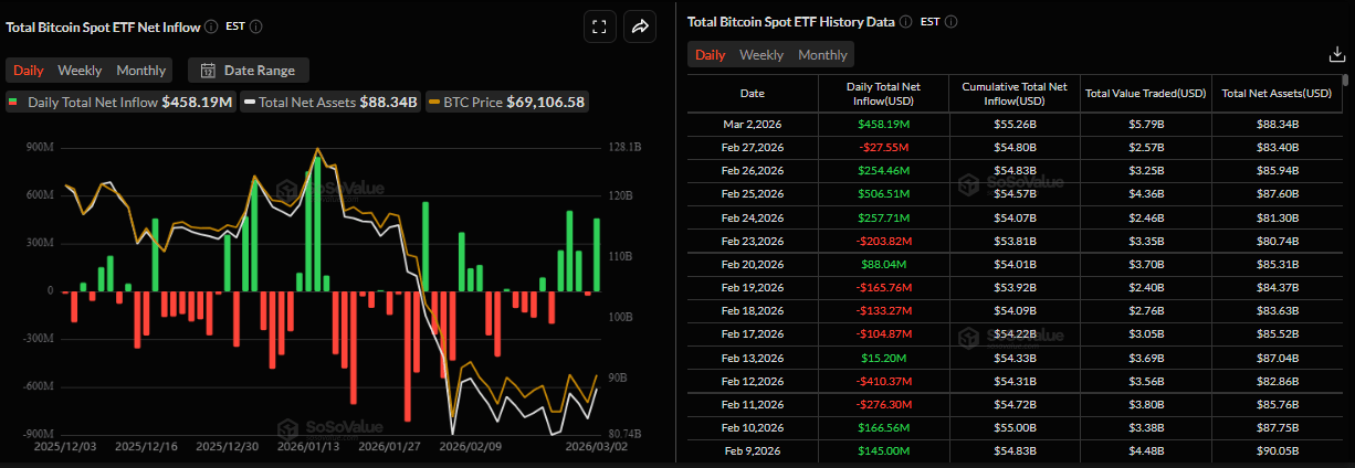 La demanda institucional de Bitcoin comenzó la semana con una nota positiva. Los datos de SoSoValue muestran que los ETFs de Bitcoin al contado registraron entradas de 458,19 millones de dólares el lunes, tras una entrada semanal positiva la semana pasada. Si estas entradas continúan e intensifican, el BTC podría ver una recuperación en los próximos días.
