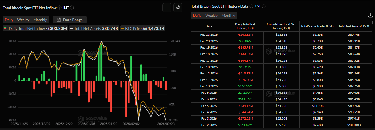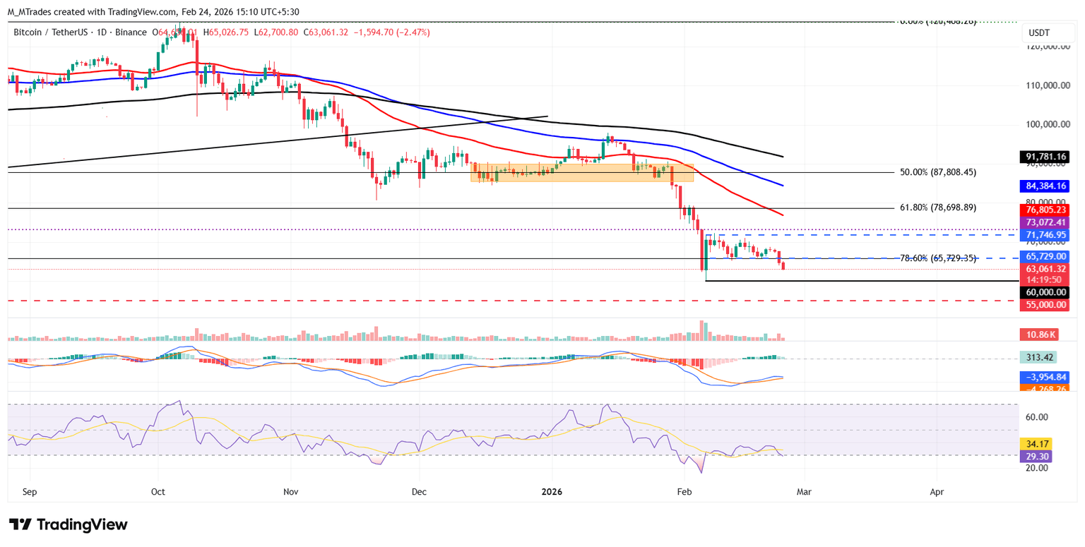 El precio del Bitcoin (BTC) extiende las pérdidas, cotizando por debajo de 64.000$ el martes, finalizando su tendencia lateral a medida que la presión de venta se renueva. La demanda institucional comenzó la semana en una nota negativa, registrando retiros el lunes, mientras que Strategy (MSTR) compró las recientes caídas. El sentimiento general sigue siendo de aversión al riesgo, ya que la creciente incertidumbre sobre el nuevo anuncio de aranceles del presidente estadounidense Donald Trump y el aumento de las tensiones entre EE.UU. e Irán limitan al Rey Cripto, aumentando los riesgos a la baja hacia los 60.000$.